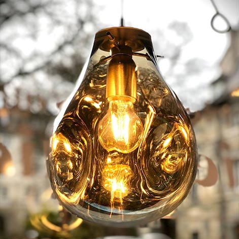 Une suspension unique de par sa forme et sa couleur grâce au verre soufflé à la main sans même l’aide d’un moule. Une fois éclairée, ses reflets métalliques s’irisent et deviennent translucides.